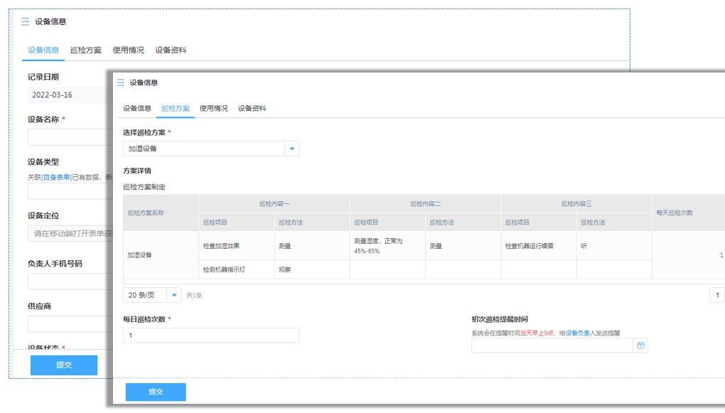 借助重深子表单功能可以同时录入或调阅与设备信息相关的多个表单内容,例如切换巡检方案表单可以确认巡检指标,减少检查纰漏。
