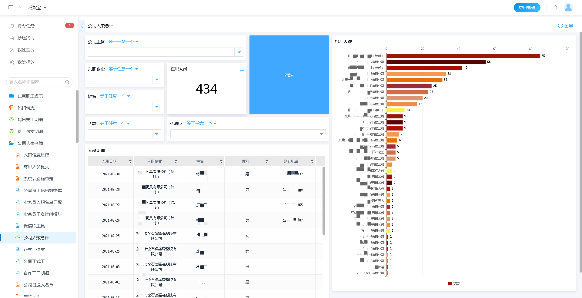 通过重深,职通宝实现了对公司的收支、员工的人事考勤、财务进行全方面的管理,同时还整合了工厂的生产情况,分公司的管理,合作伙伴的管理情况,使经营者可以快速掌握公司的运营情况,为企业决策提供数据支撑。