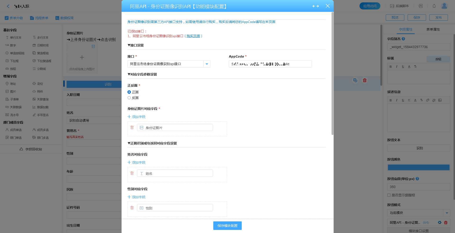 1、利用重深对接外部API的能力,全自动识别入职员工的身份信息,减少繁琐的个人信息输入步骤,大大提升了人事办事效率。
