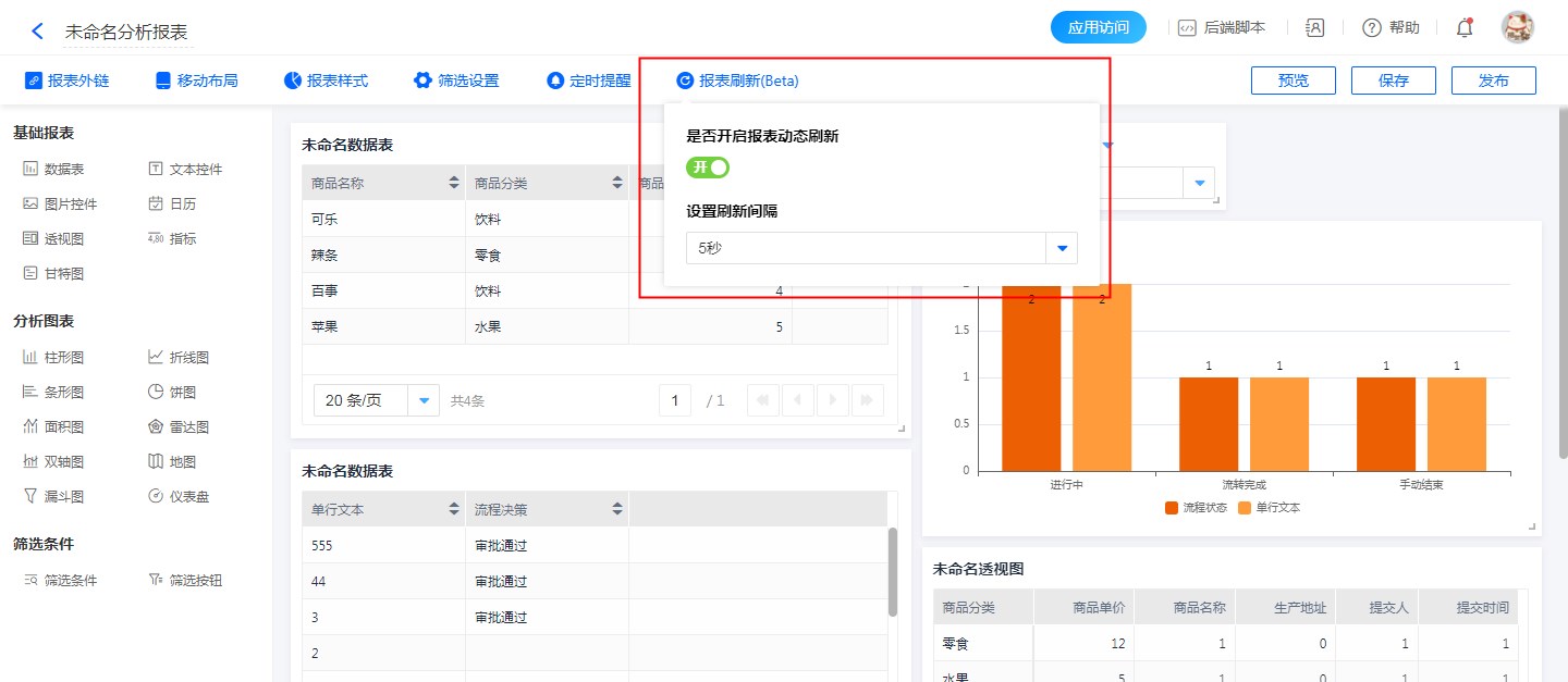 在一些使用报表展示的场景,如销售数据展示、汇报总结等,通过报表动态刷新功能,定时自动刷新报表数据,这样就可以让观众了解到实时数据。
