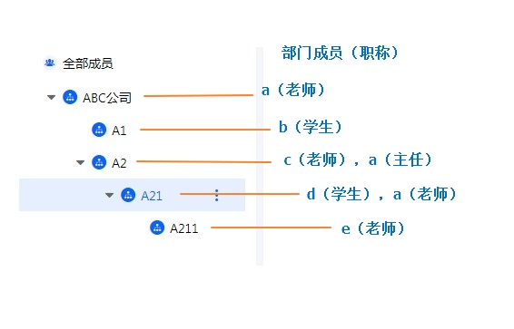 当前用户所在部门及子部门的成员:如用户c,所在部门A2,其所在部门及子部门包括A2、A21、A22。