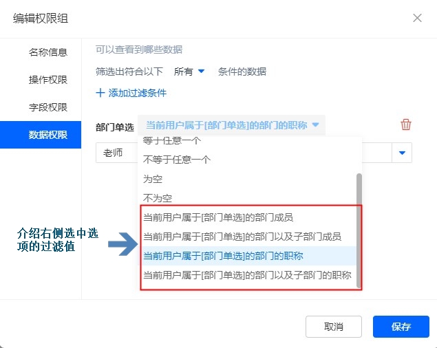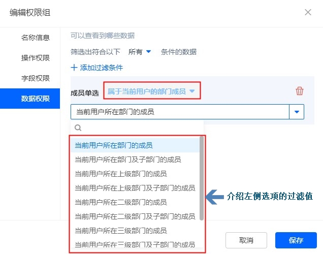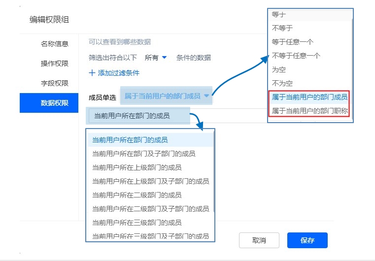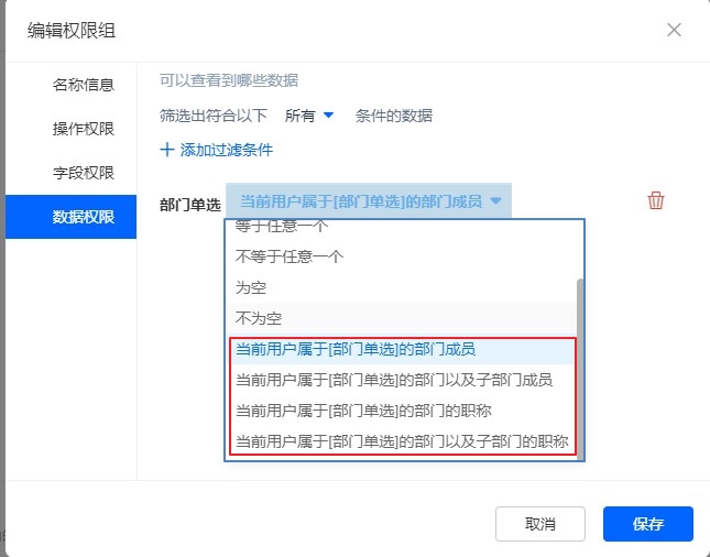 成员部门字段新增的过滤方式,在表单/报表权限-自定义权限组-数据权限设置、报表过滤条件中支持使用,下图为自定义权限组的数据权限设置。