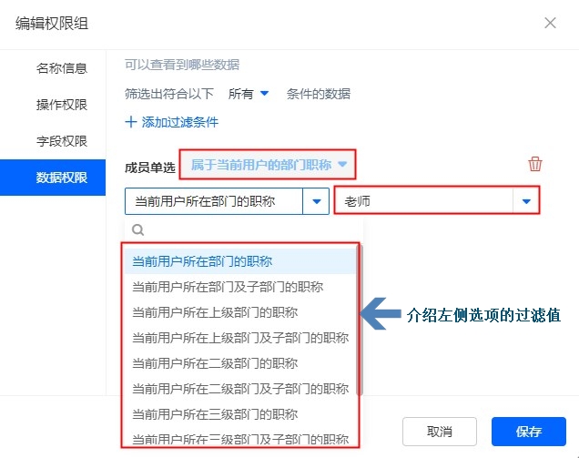 当前用户所在部门的职称:获取当前用户所在的部门的成员中,职称为老师的成员数据。