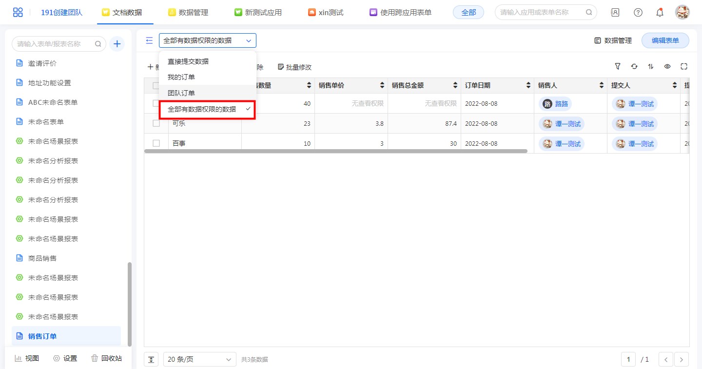 若成员除了直接提交数据的权限以外不具有两个或者两个以上的权限组,则不会有合并权限组,不会出现全部有数据权限的数据。
