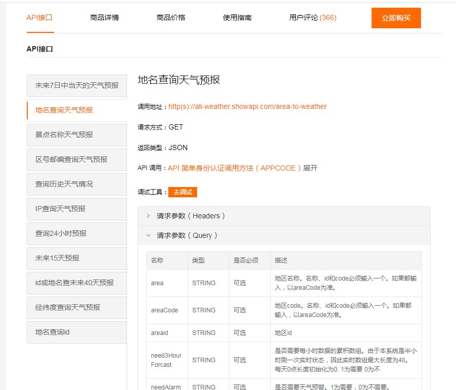 • URL:https://ali-weather.showapi.com/area-to-weather?area=城市天气.城市