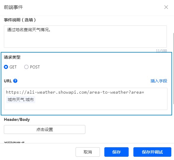 添加好前端事件后,首先设置前端事件的基础信息,即事件名称和事件说明,用于区分前端事件: