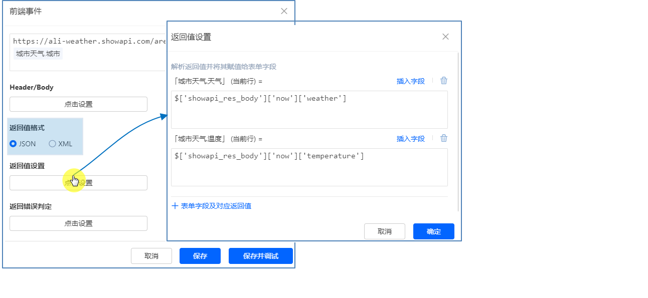 • 返回值设置页面,添加 「城市天气.天气」 (当前行) 、「城市天气.温度」 (当前行) :
