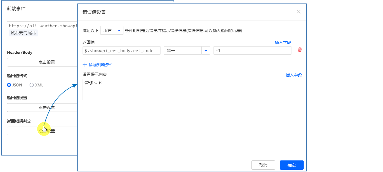 根据接口返回的错误码,我们可以设置返回值错误判定,当返回判定错误时弹出提示。