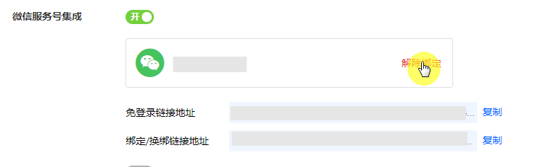 管理员登录后,点击 [解除绑定],则立即解绑已认证服务号,所有登录/绑定链接失效。