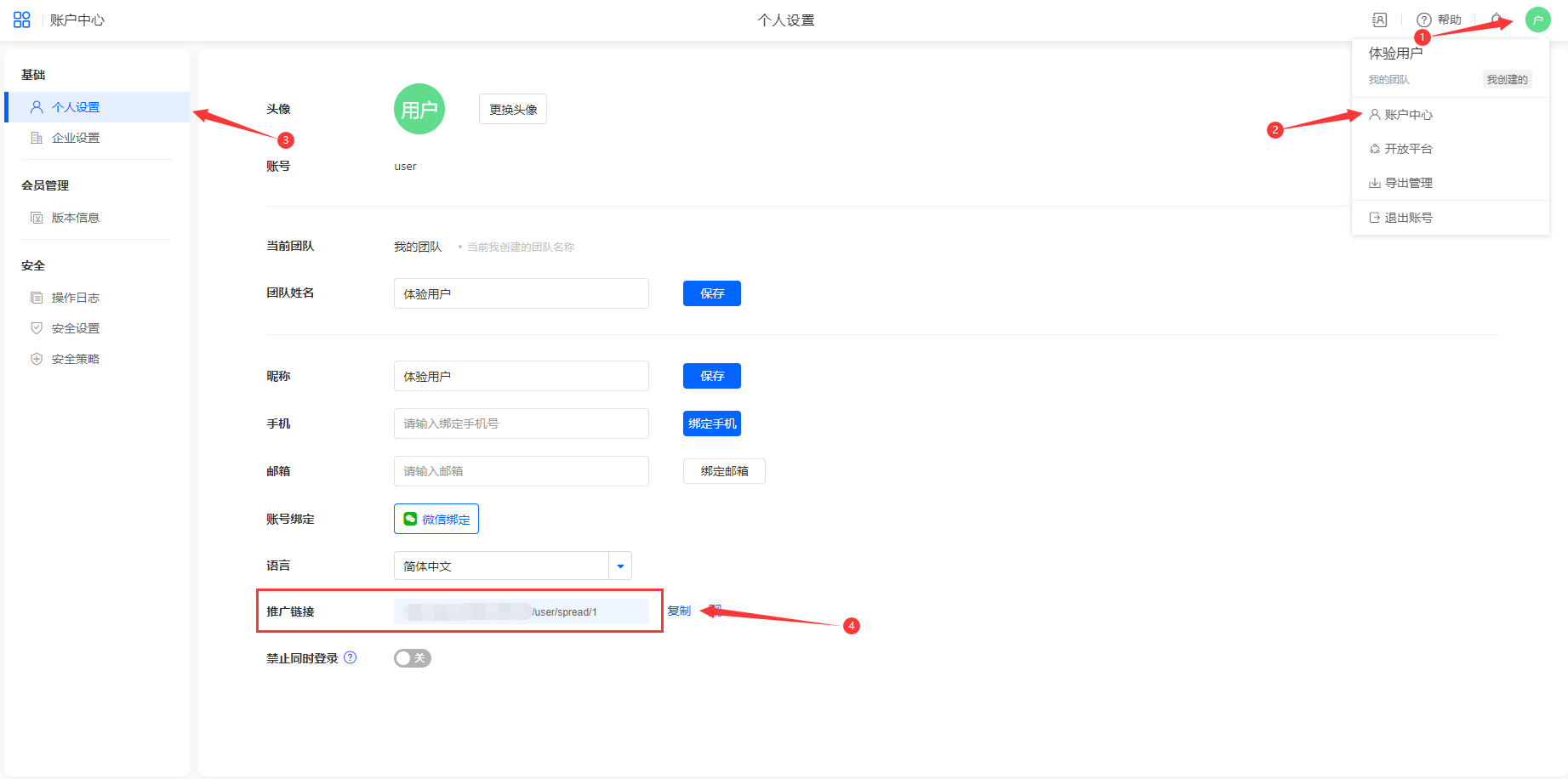 • 推广者账号:推广者用户账号