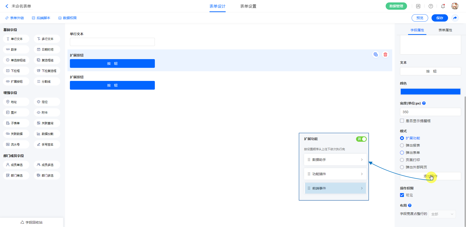 前端事件是扩展按钮基本功能之一,设置扩展按钮的属性为