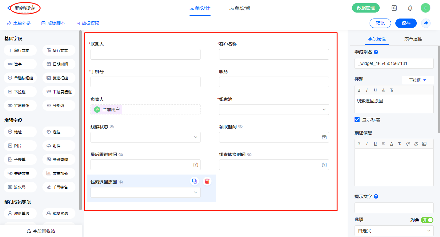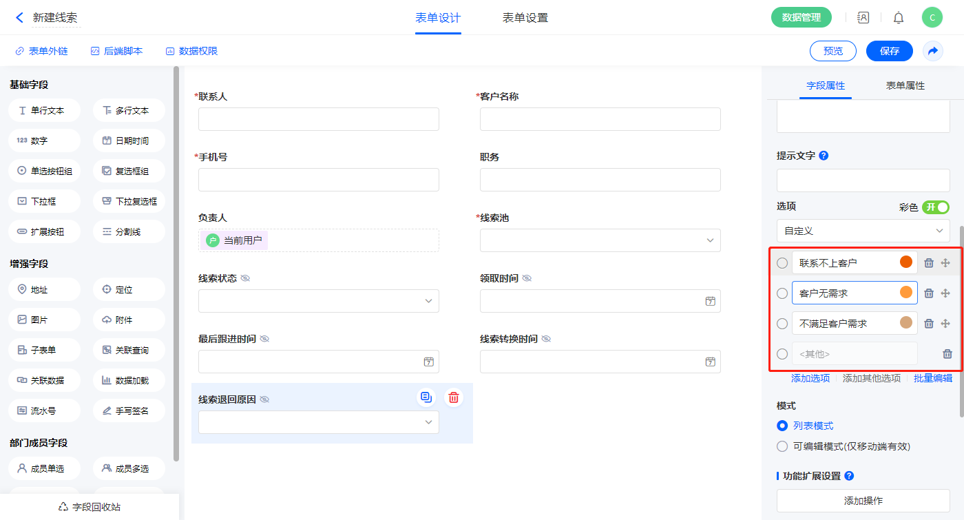 2)选中【线索退回原因】字段,在选项输入退回原因选项;