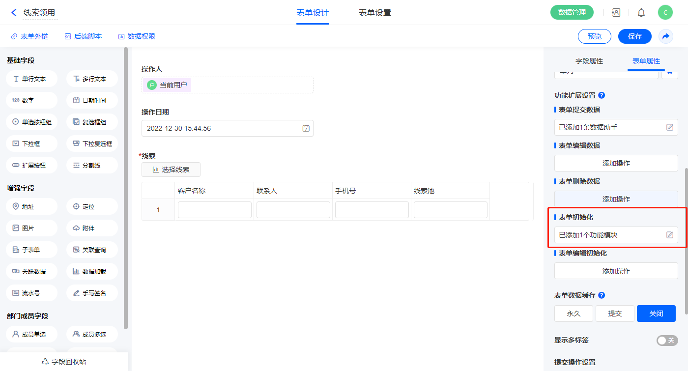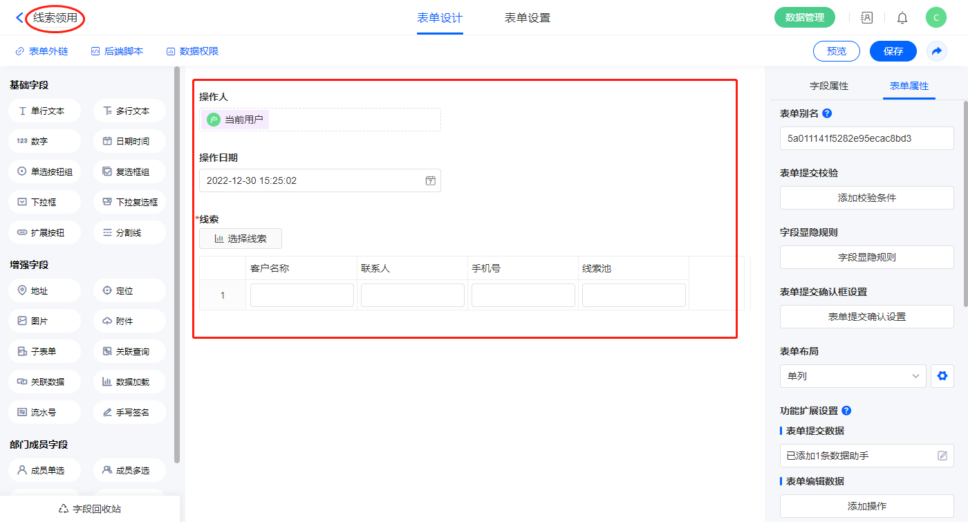 1)表单提交数据新增数据助手添加主表【新建线索】的数据;