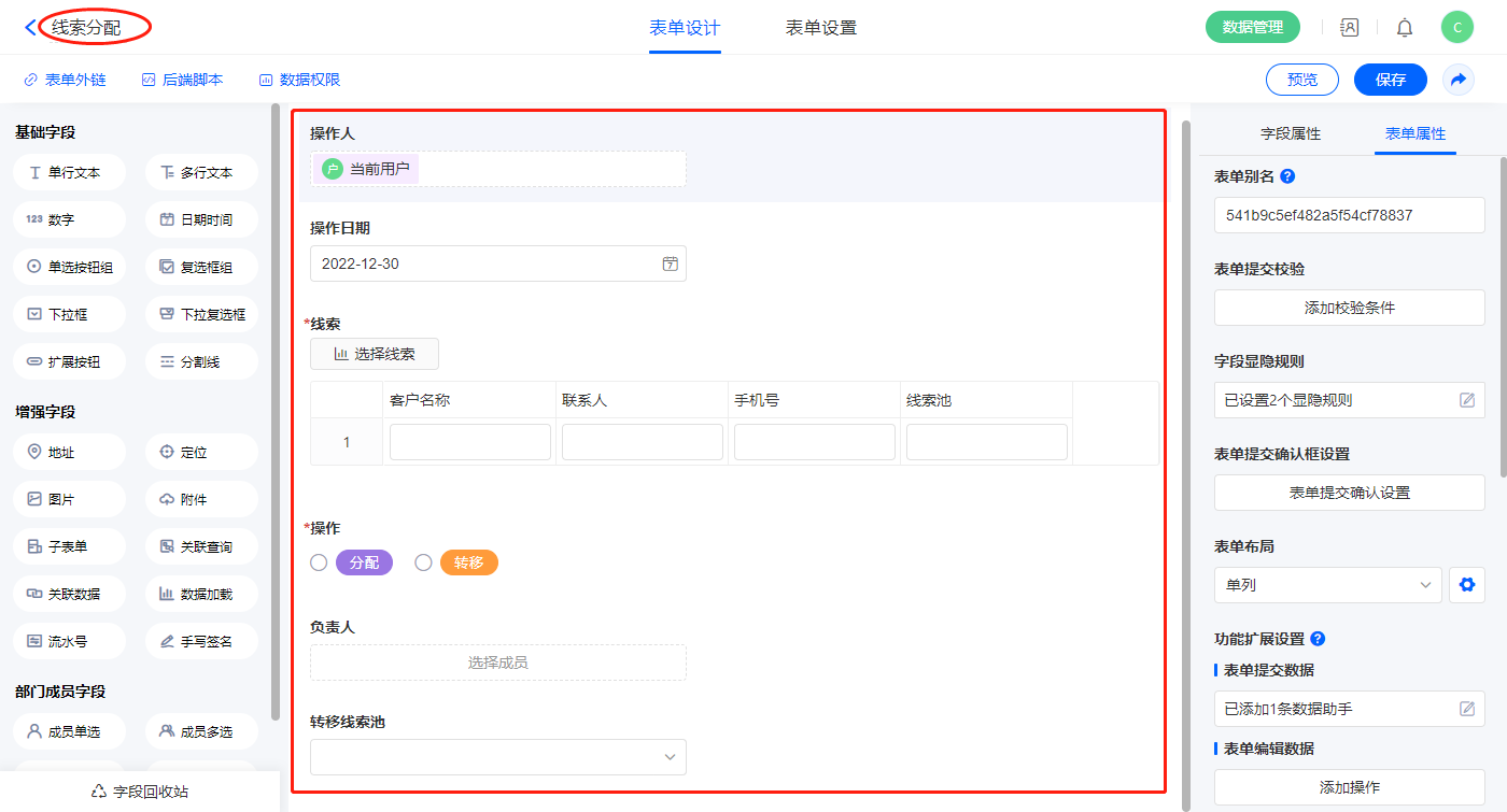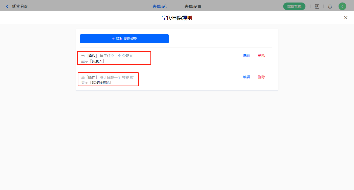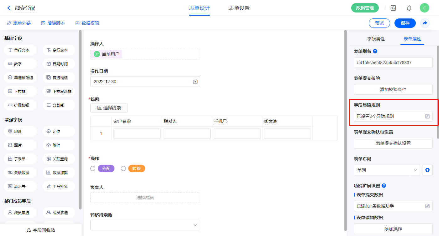 1)设置两条显隐规则,当【操作】单选按钮组字段选择分配显示负责人字段,当【操作】字段单选按钮组选择转移显示转移线索池字段;