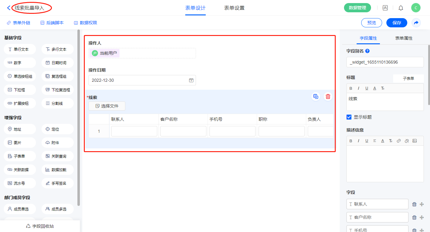 2.7、辅助表【客户批量导入】字段及表单属性设置