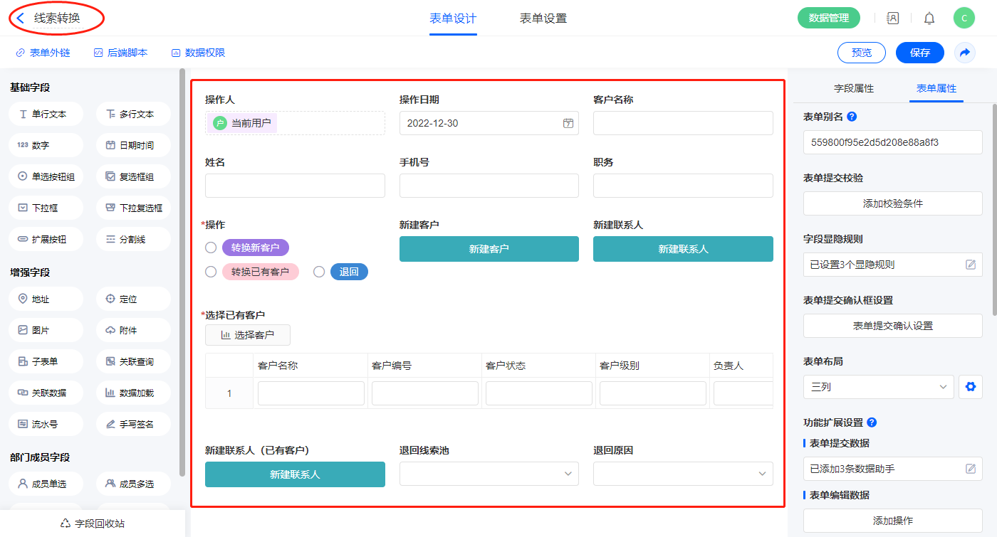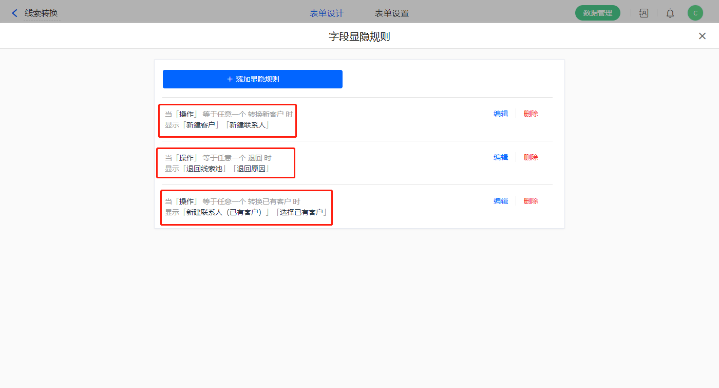 1)设置三条显隐规则,当【操作】单选按钮组字段选择退回显示【退回原因】、【退回线索池】两个字段;当【操作】单选按钮组字段选择转换新客户显示【新建客户】、【新建联系人】两个字段;当【操作】单选按钮组字段选择转换已有客户显示【新建联系人(已有客户)】、【选择已有客户】两个字段;