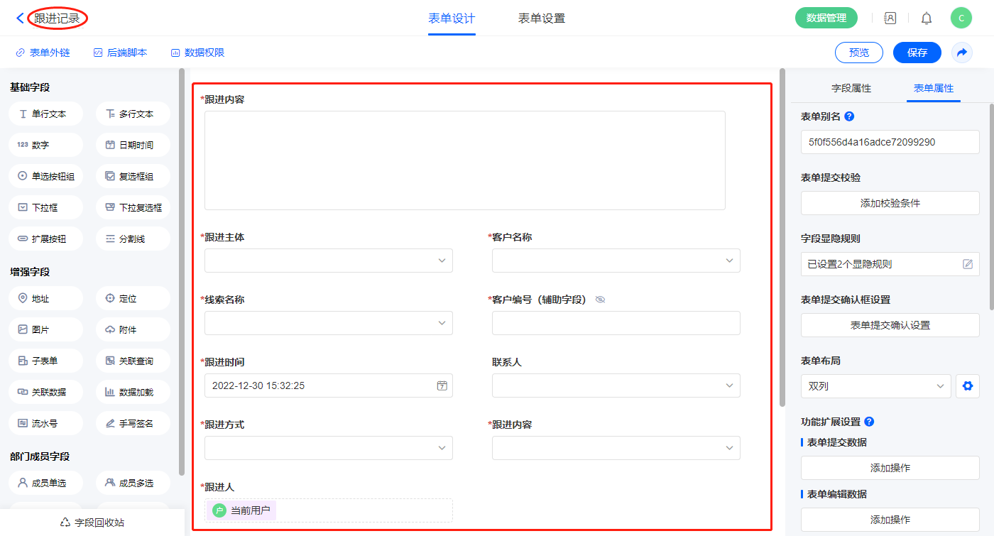 2.8、辅助表【跟进记录】表字段及表单属性设置