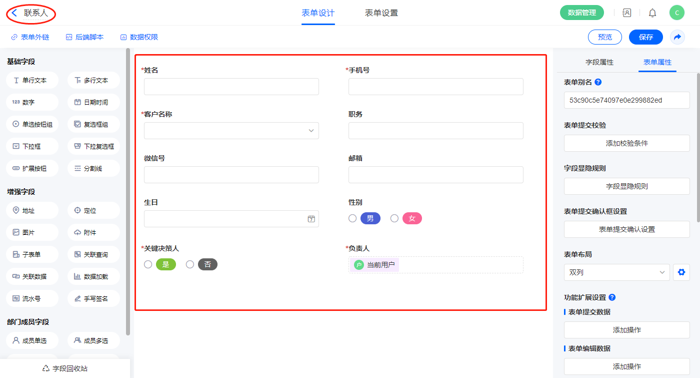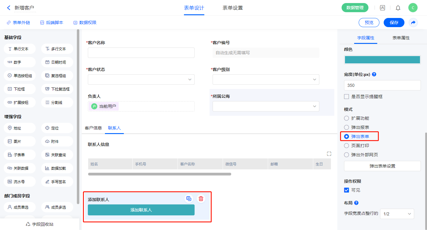 3)选择【添加联系人】扩展按钮字段,模式选择弹出表单;