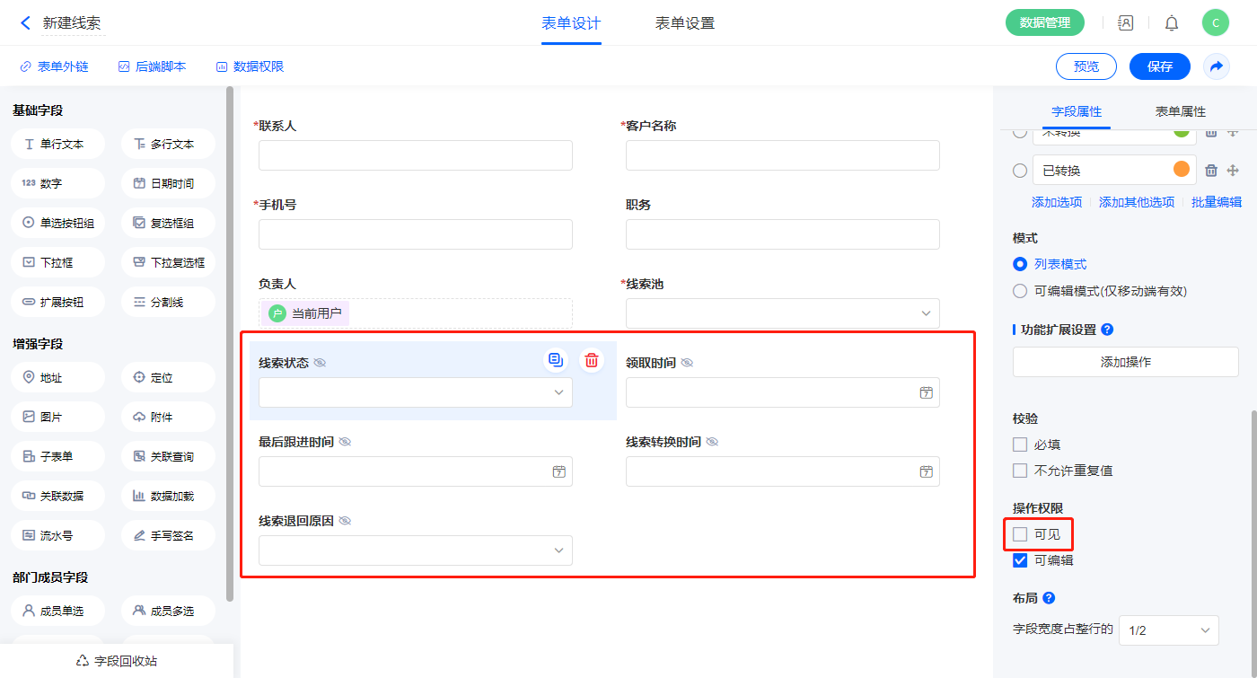 3)【领取时间】、【线索退回原因】、【线索状态】、【线索转换时间】、【最后跟进时间】字段设置为不可见;