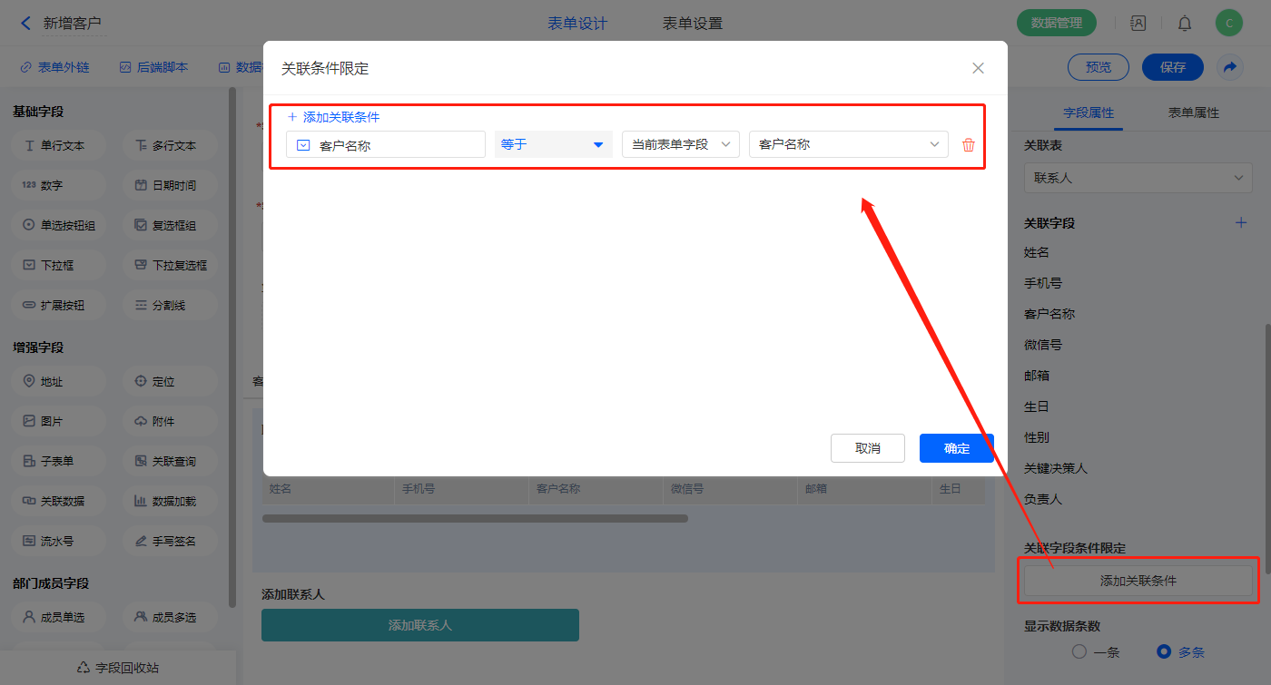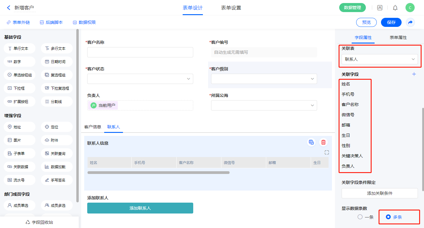 2)选择【联系人信息】关联查询字段,设置关联表为【联系人】并如图选择关联字段,设置显示数据条数为多条;
