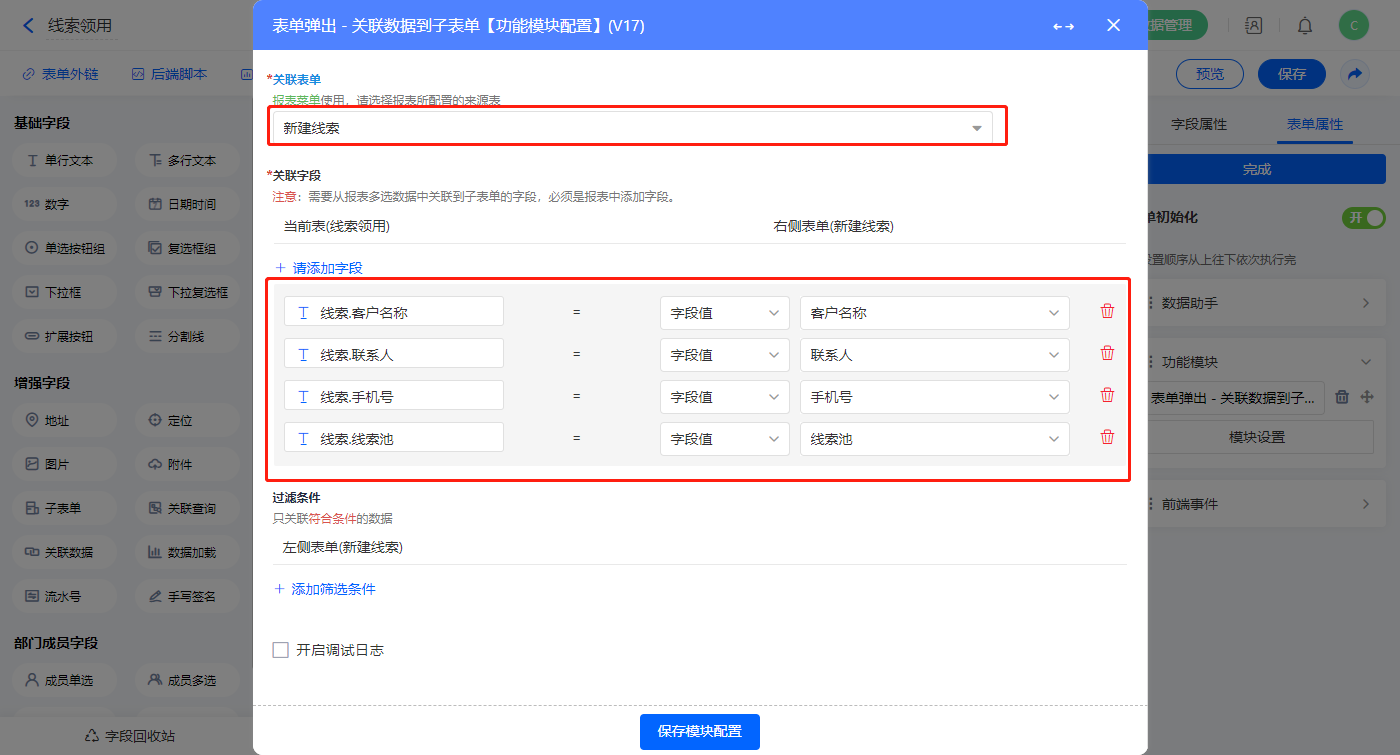 选择关联表单为主表【新建线索】,添加该表的子表单字段对应主表的字段,设置完成点击【保存模块设置】;