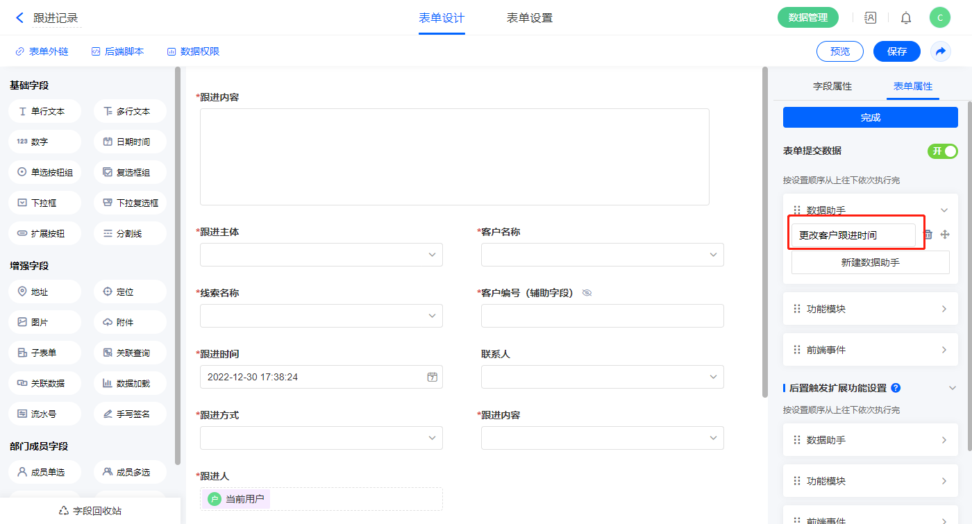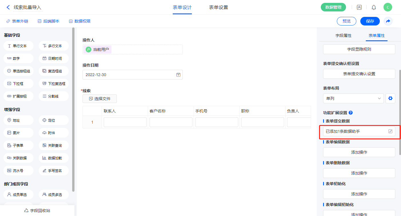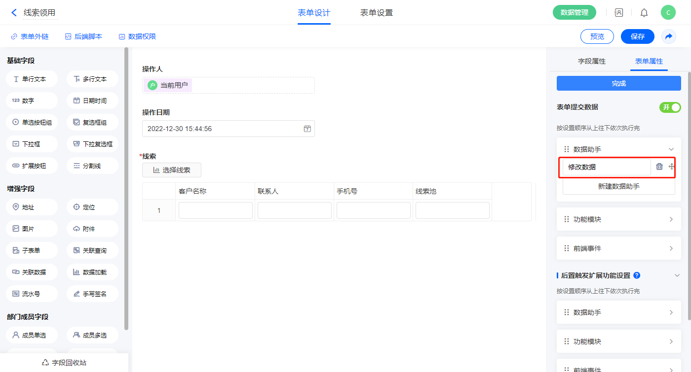 4)表单提交数据新增数据助手修改主表【新建线索】的数据;