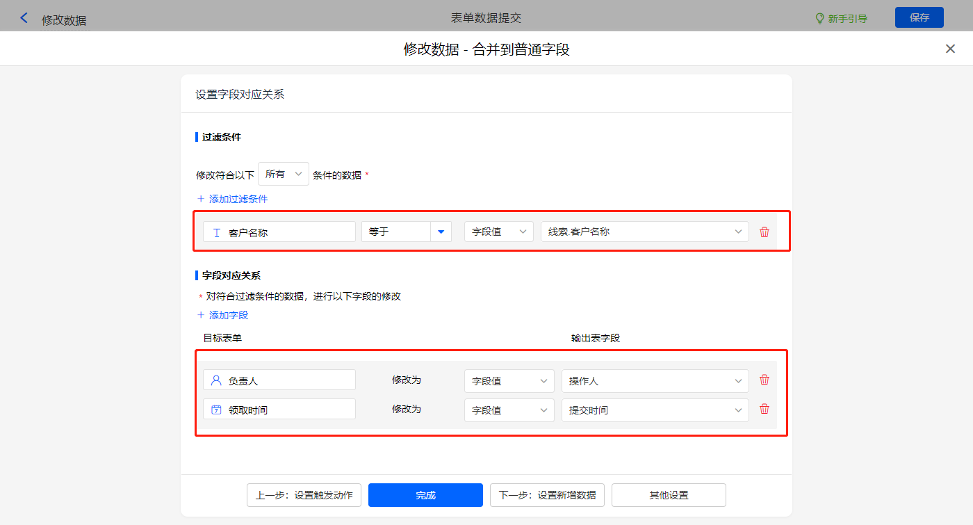 新增修改数据的执行动作,选择修改【新建线索】表单,选择对应过滤条件,以及需要修改的字段,设置好点击【完成】并保存该数据助手;