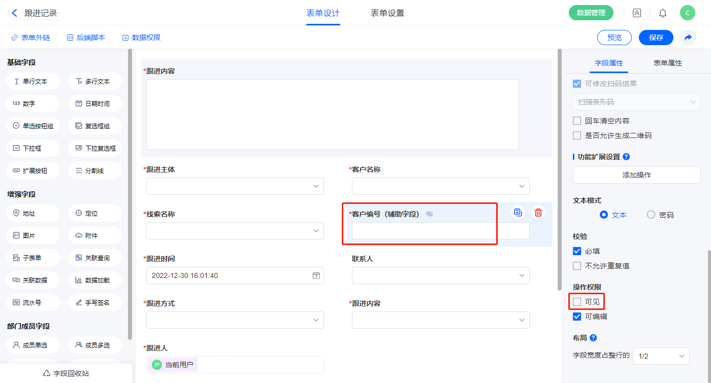 1)选中【客户编号(辅助字段)】字段,不可见属性取消勾选,设置为隐藏;