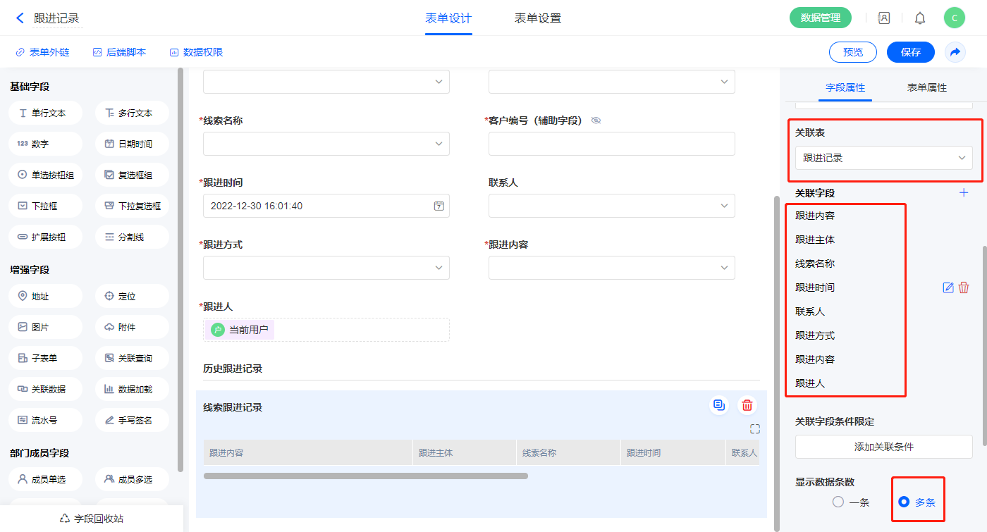 2)选中历史跟进记录的关联查询字段,设置关联表为【跟进记录】并选择关联字段,显示数据条数设置为多条;