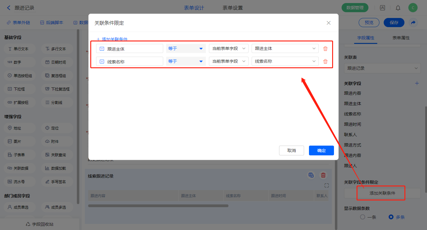 如图添加关联条件,根据【跟进主体】、【线索名称】字段相关联;