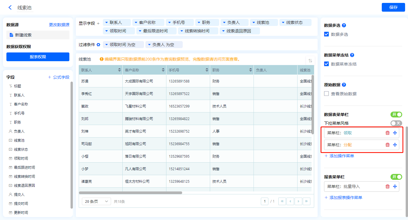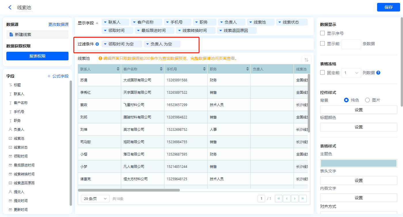 1)新增【线索池】报表,用基础报表【数据表】展示数据源为主表【新建线索】的数据;
