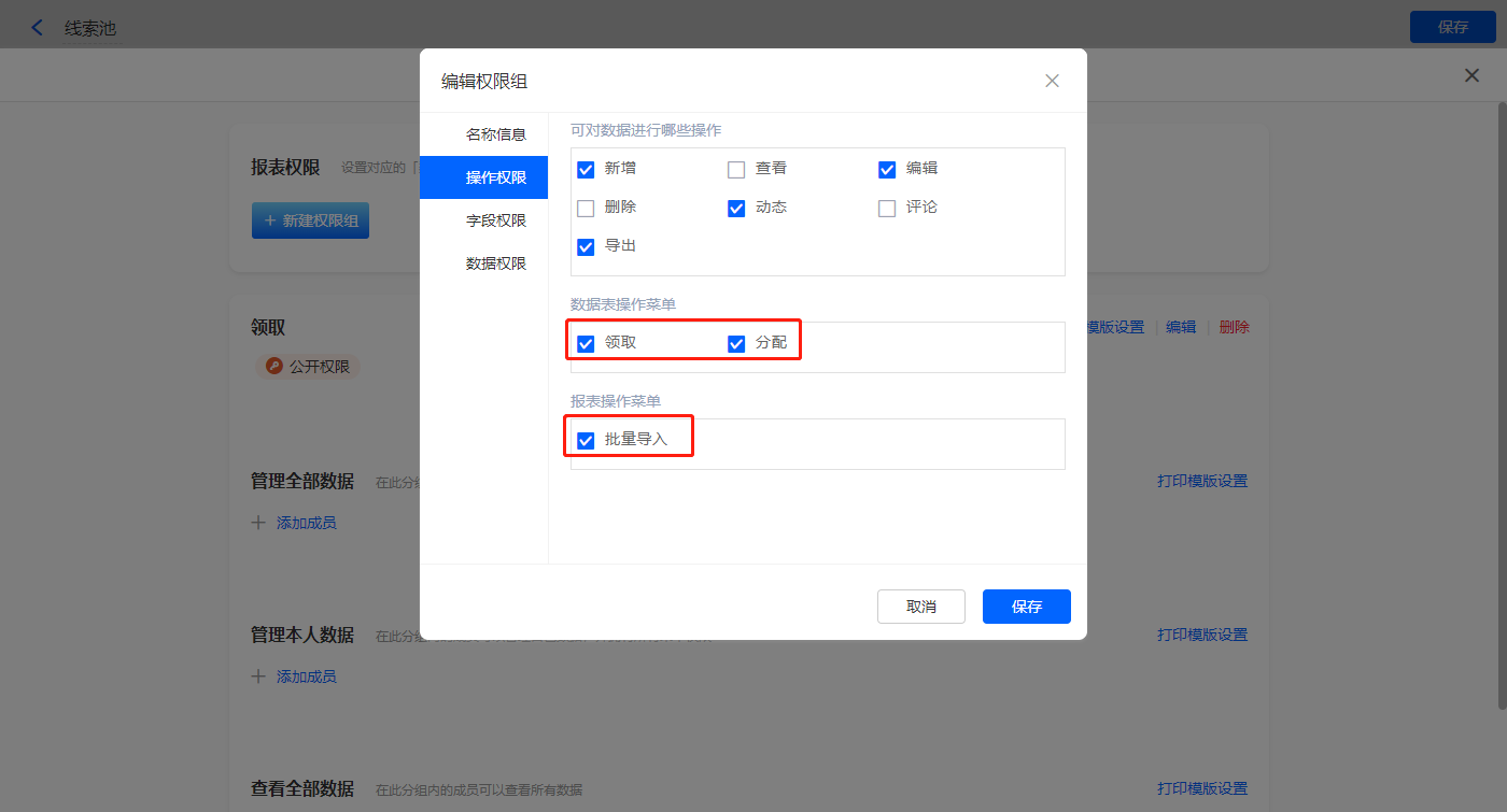 【批量导入】的报表菜单,操作模式设置为弹出辅助表单【线索批量导入】,并设置刷新模式为整表刷新;