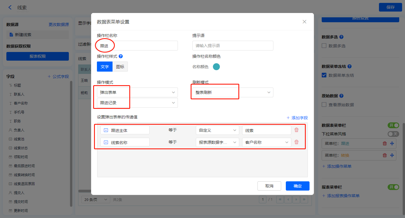 【跟进】的菜单栏,操作模式设置为弹出辅助表单【跟进记录】,并设置刷新模式为整表刷新,设置表单传递值,点击【确认】;