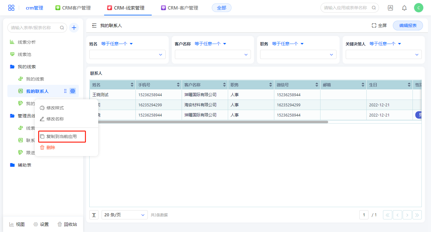 1)该报表为管理员查看,复制【我的线索】报表,名称改为【线索】;