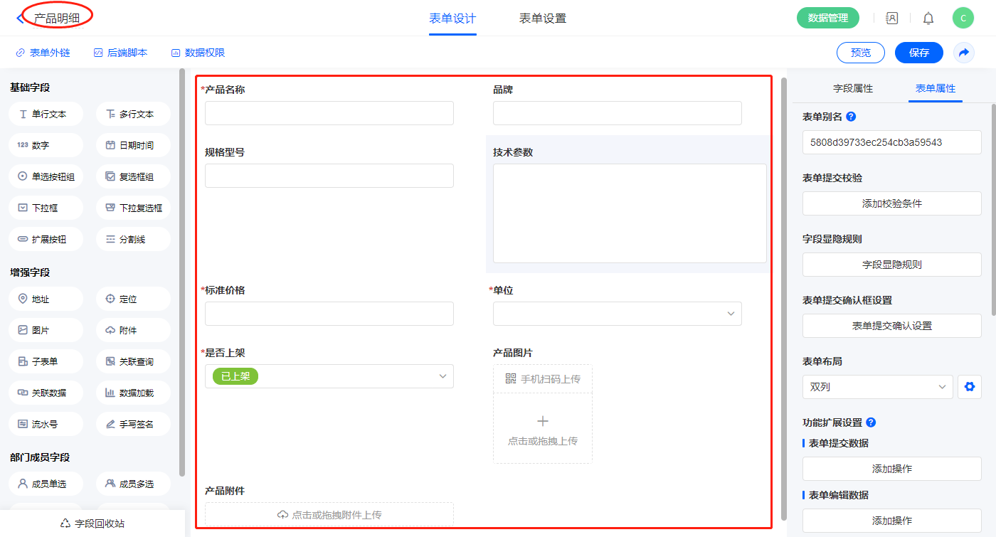 数据加载的设置如下图,数据源为【产品明细表单】,设置对应显示的字段;