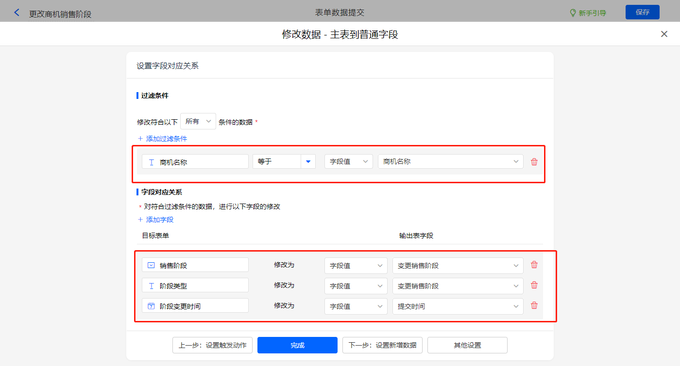 触发条件设置为当【变更销售阶段】字段等于【输单】,则修改主表【输单原因】、【销售阶段】、【阶段变更时间】、【阶段类型】四个字段的值;