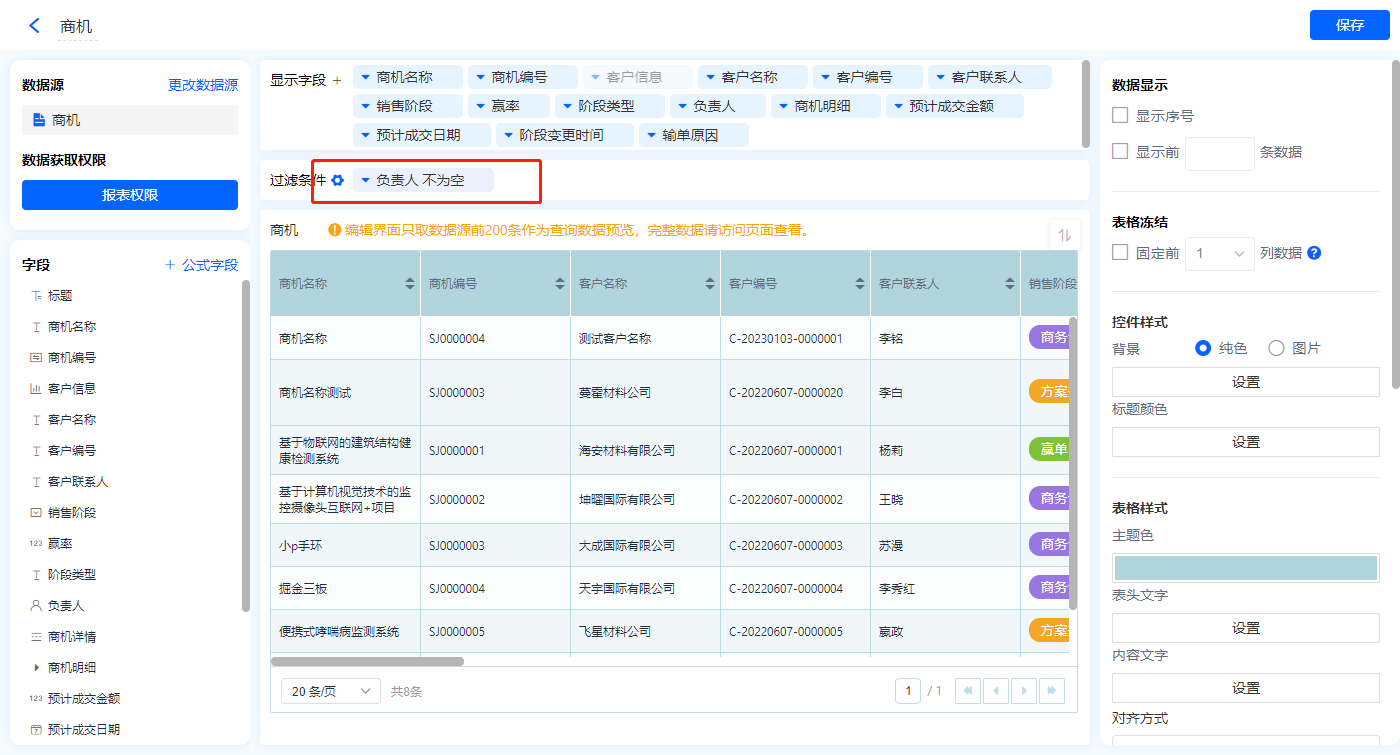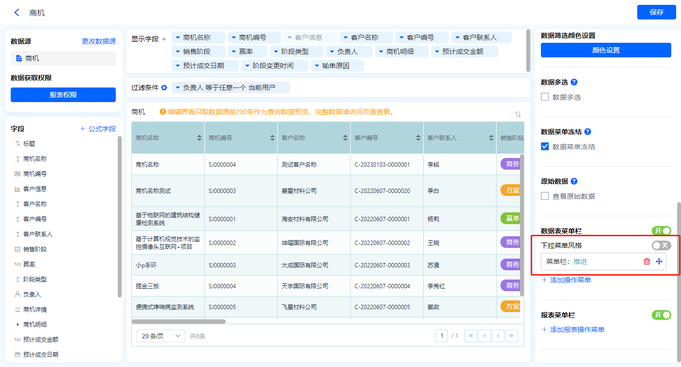 1)新增【我的商机】报表,用基础报表【数据表】展示数据源为主表【商机】的数据;