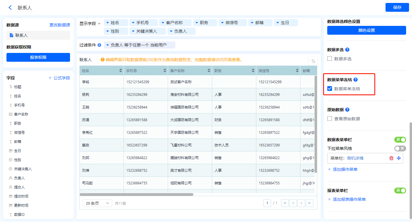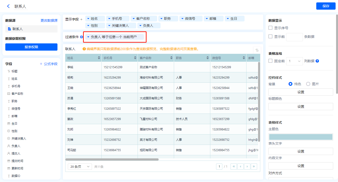 1)新增【我的联系人】报表,用基础报表【数据表】展示数据源为辅助表【联系人】的数据;