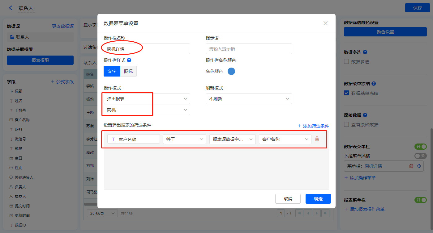 【商机详情】的菜单栏,操作模式设置为弹出报表【商机】,设置表单传递值,点击【确认】;