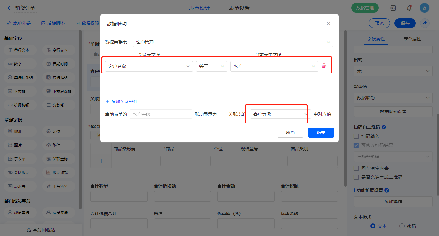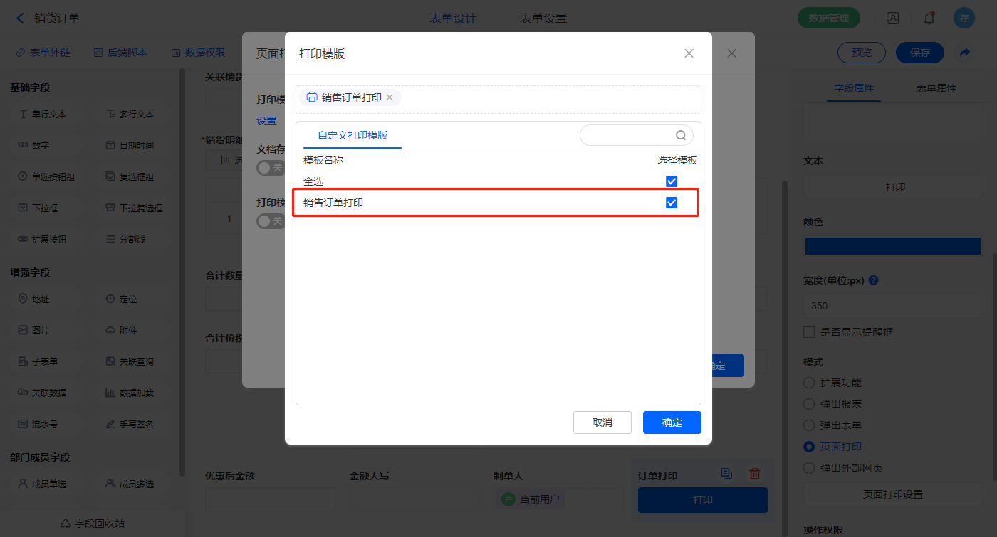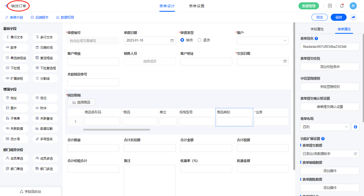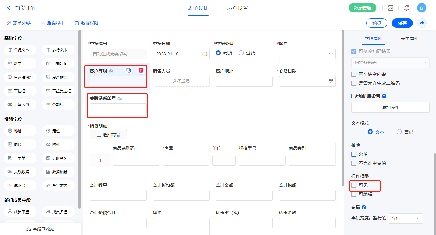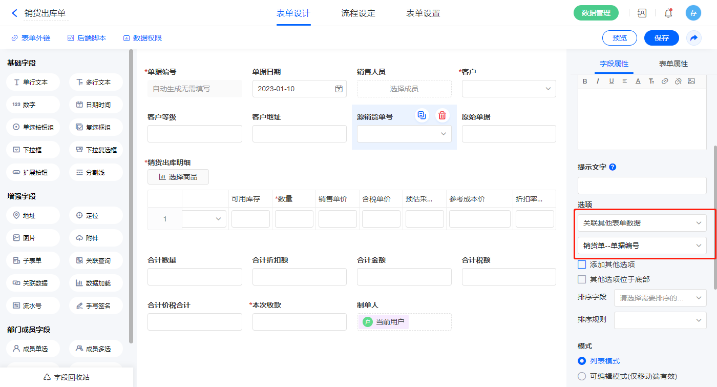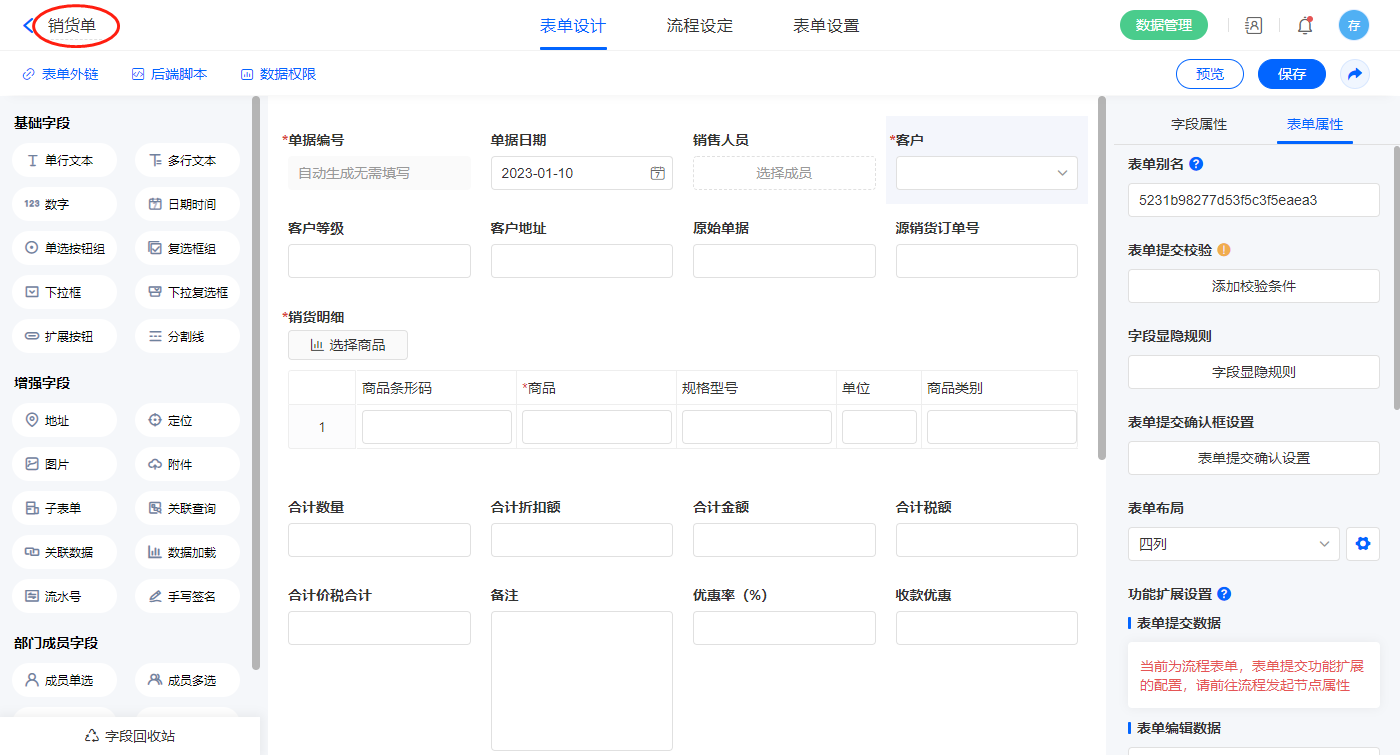 2.4、表单【销货单】字段及表单属性设置