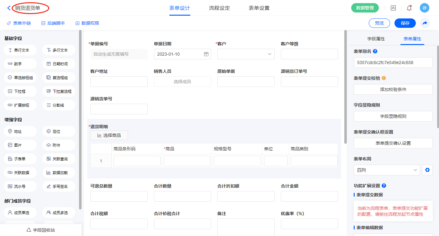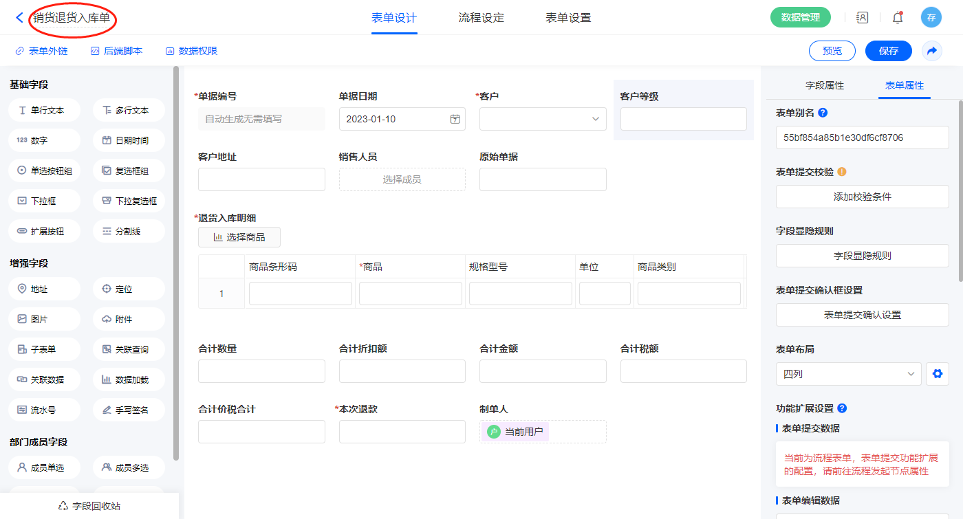 2.5、表单【销货退货单】字段及表单属性设置
