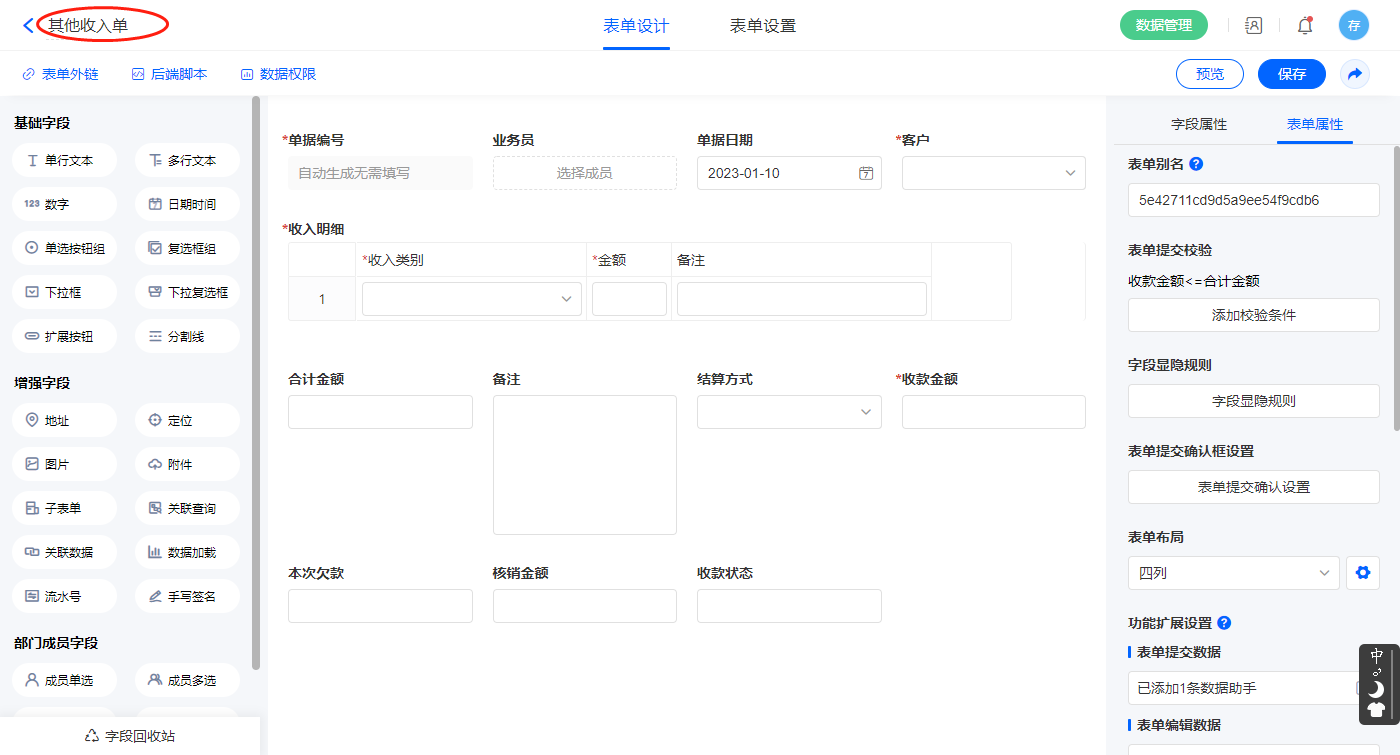 2.10、表单【其他收入单】字段及表单属性设置