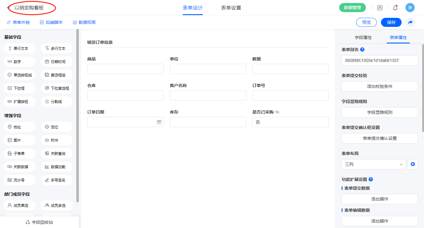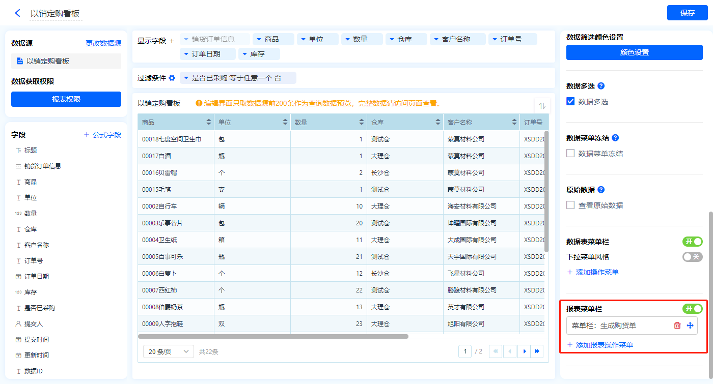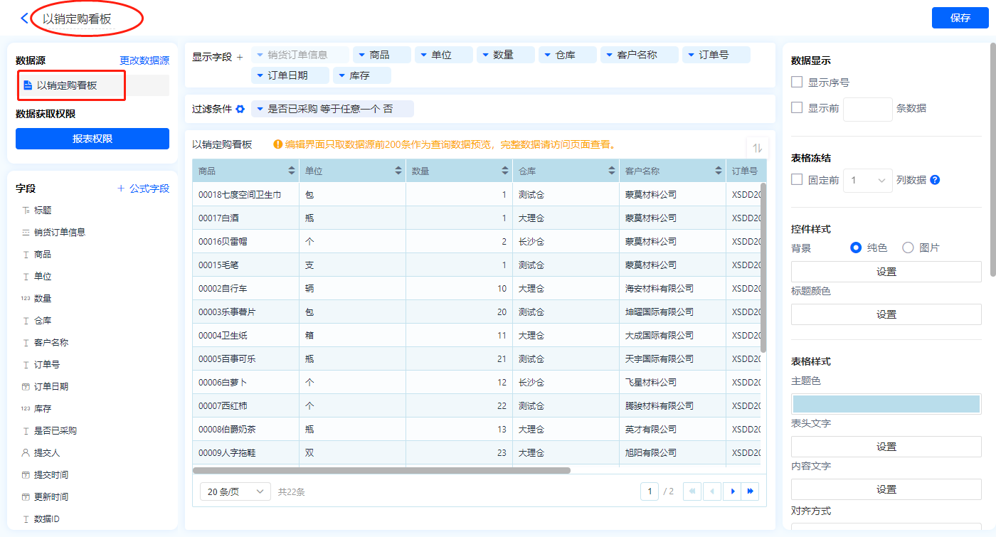 1)新增【以销定购看板】报表,用基础报表【数据表】展示数据源为表单【以销定购看板】的数据; 全部设置完成点击【保存】,选择【应用访问】进行查看效果;