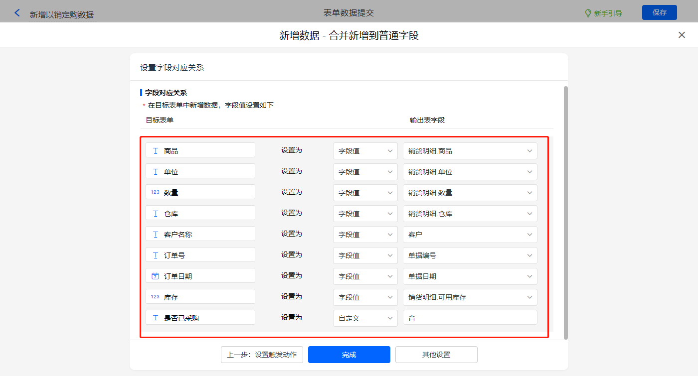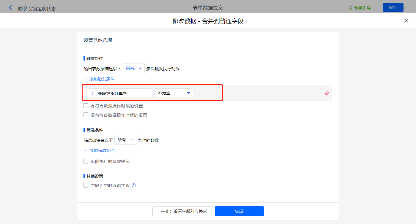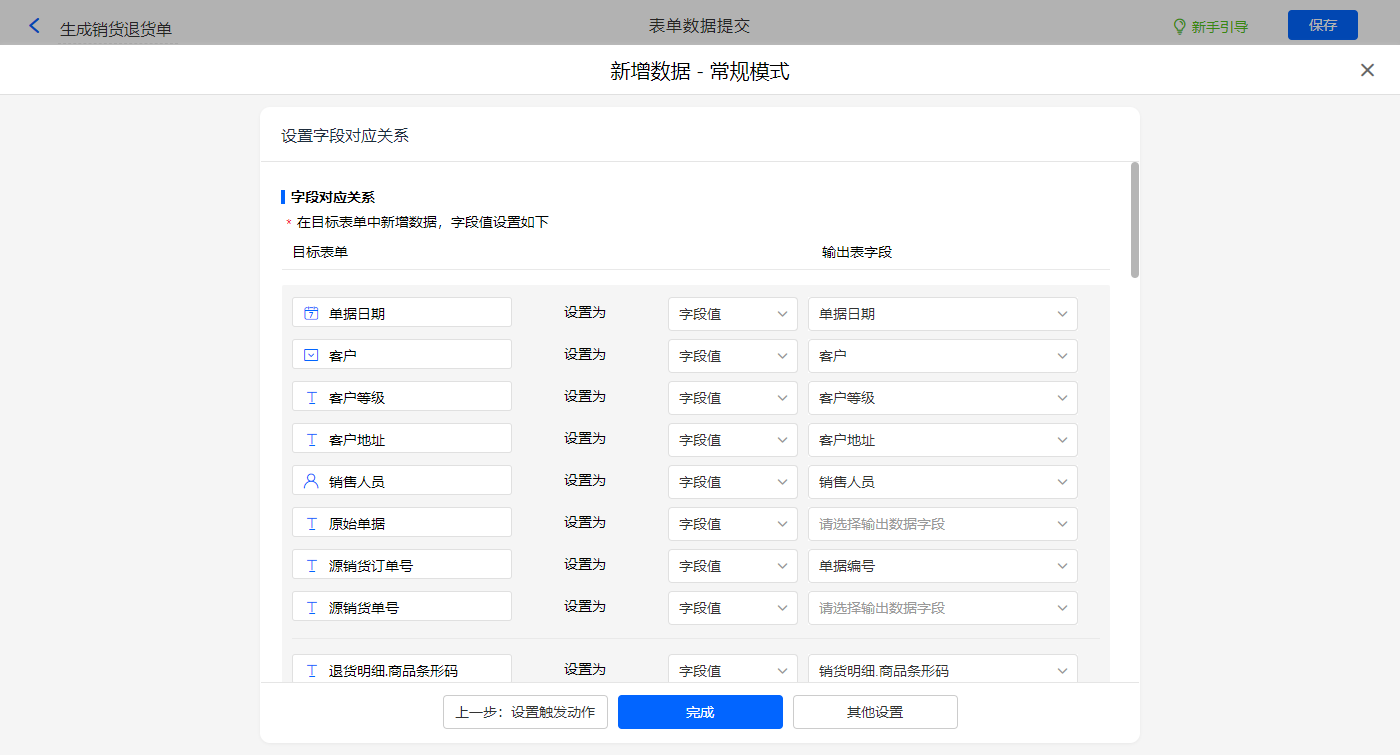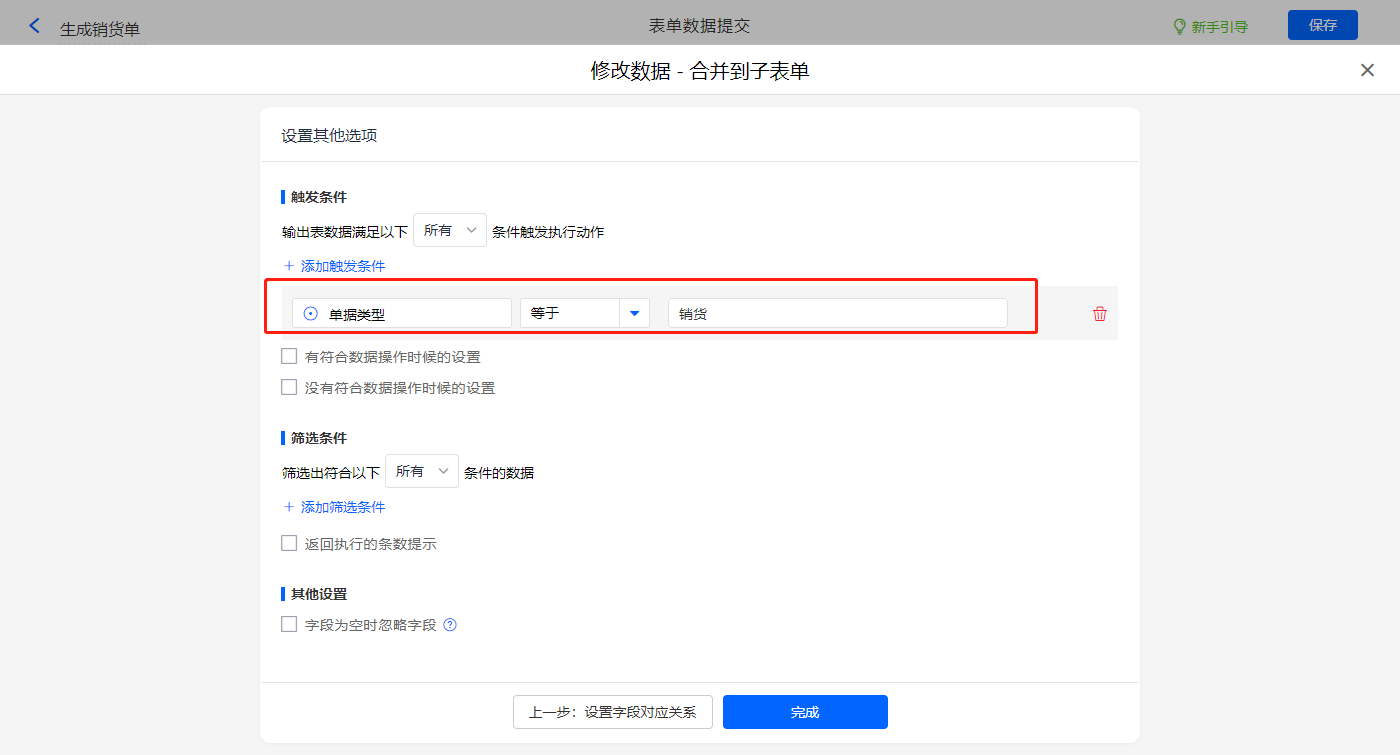 其他设置触发条件为【单据类型】字段等于退货,设置好点击【完成】并保存该数据助手;