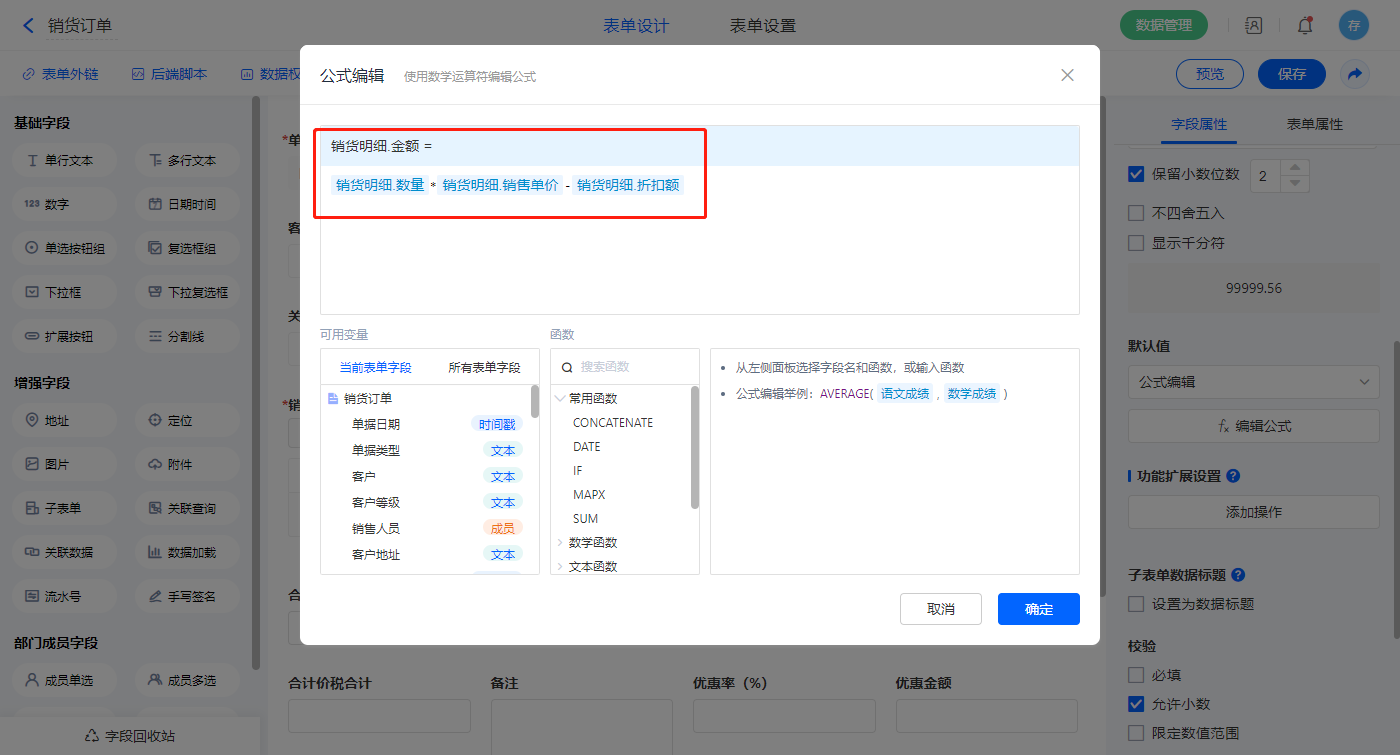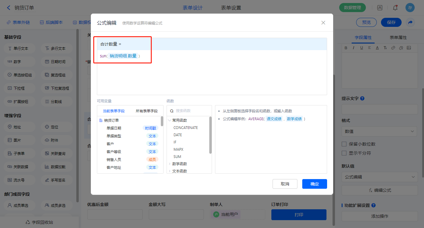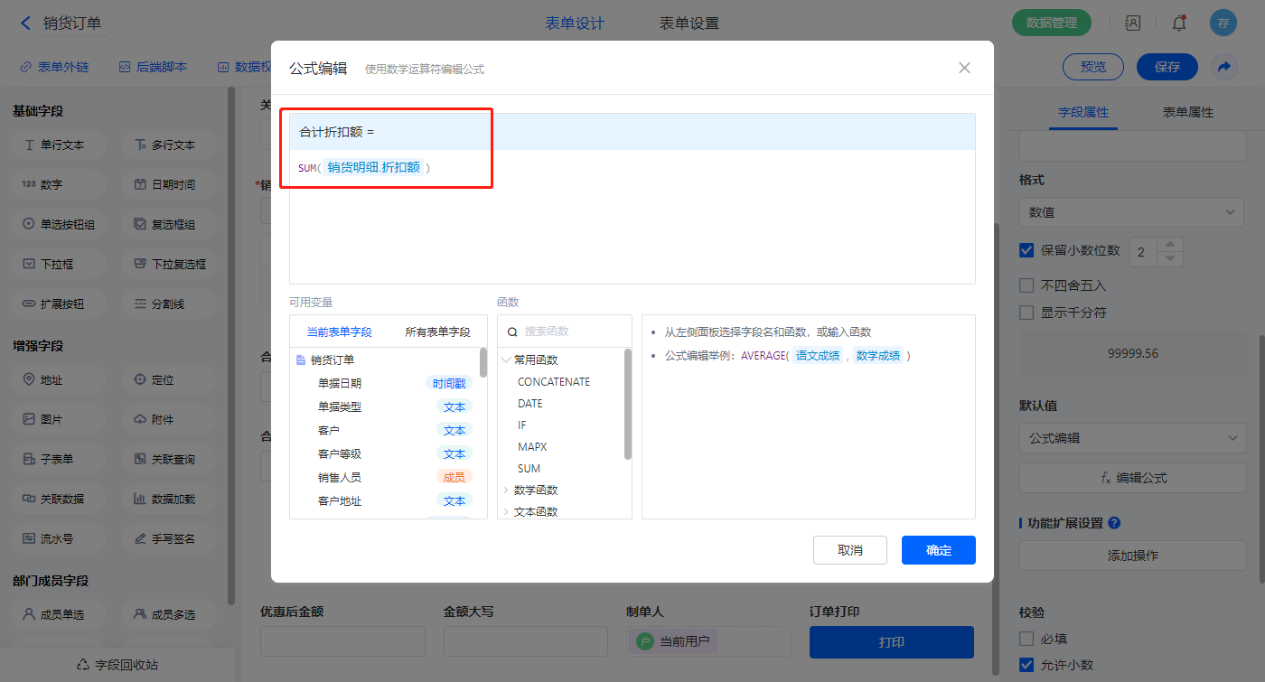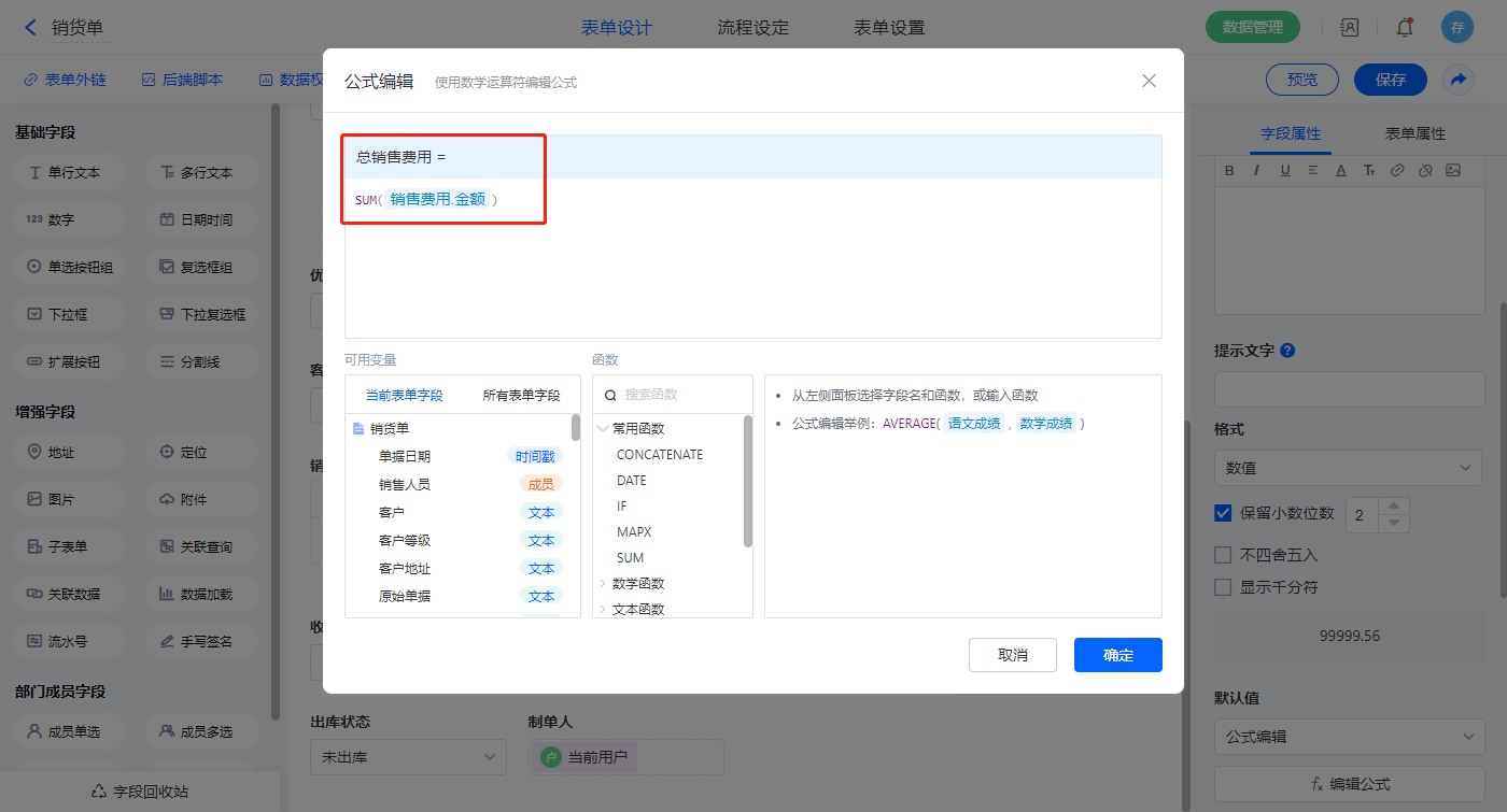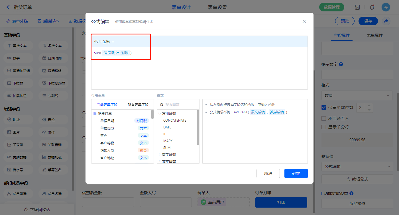 1)【合计金额】字段默认值设置为公式编辑,如图设置公式;