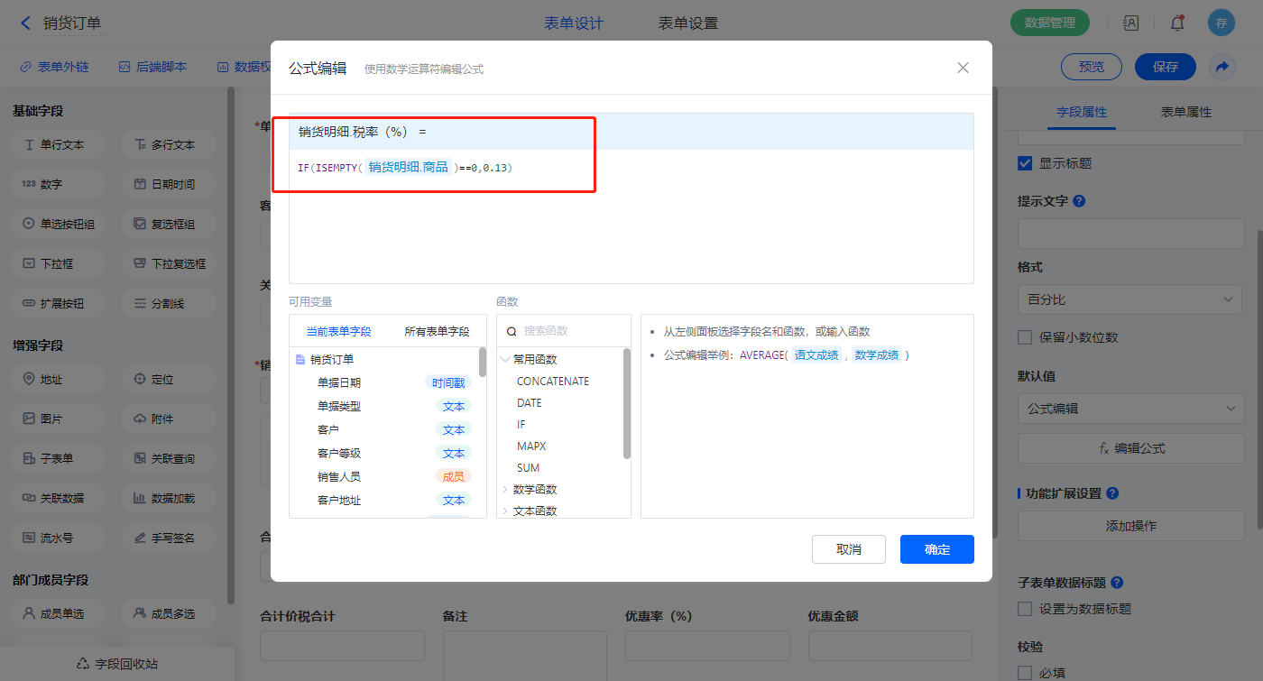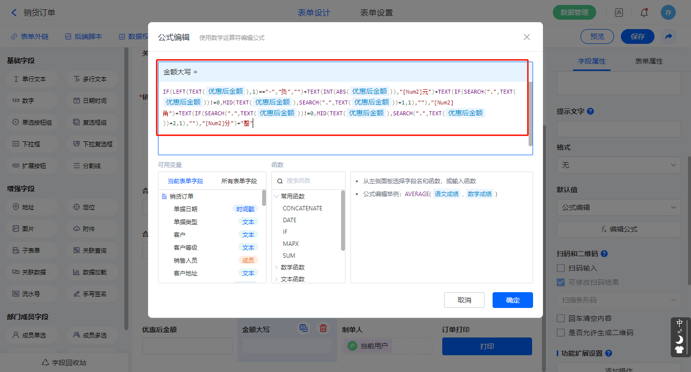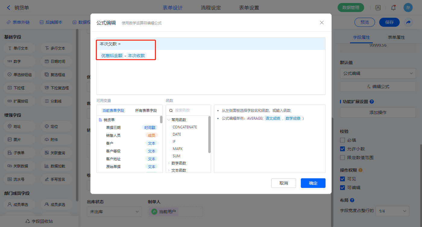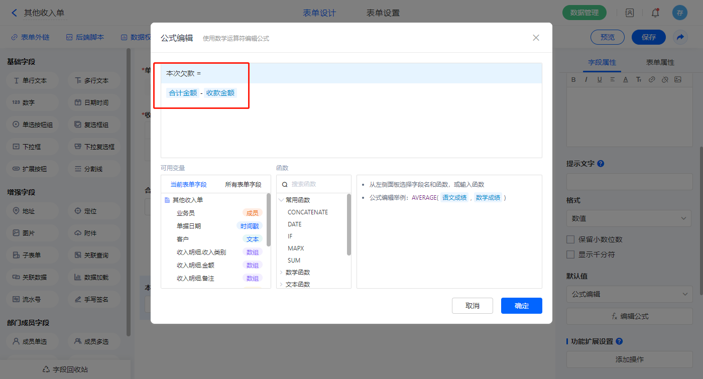 【本次欠款】字段默认值设置为公式编辑,如图设置公式;