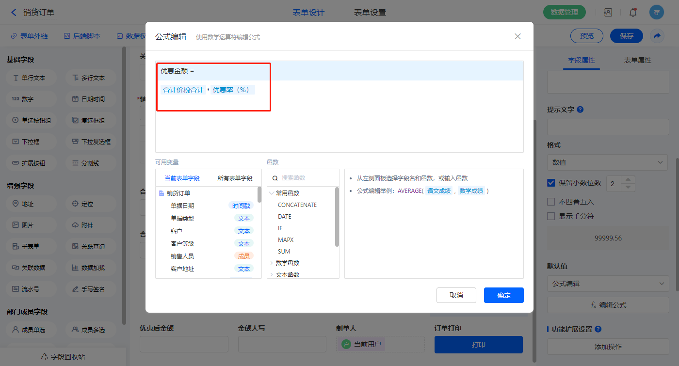 1)【销货明细.可用库存】、【销货明细.销售单价】、【销货明细.预估采购价】、【销货明细.参考成本价】、【销货明细.预估毛利】、【销货明细.预估毛利率(%)】、【销货明细.预估毛利率(含税)】、【销货明细.预估毛利(含税)】【销货明细.含税单价】、【销货明细.折扣额】、【销货明细.金额】、【销货明细.税率(%)】、【销货明细.税额】、【销货明细.价税合计】、【销货明细.价税合计】、【合计数量】、【合计折扣额】、【合计金额】、【合计税额】、【合计价税合计】、【优惠金额】、【优惠后金额】、【金额大写】以上字段如2.3设置公式; 选择【本次欠款】字段,设置默认值为公式编辑,如图设置公式;