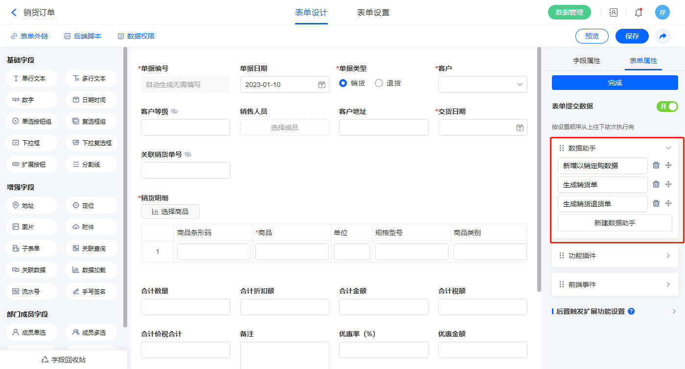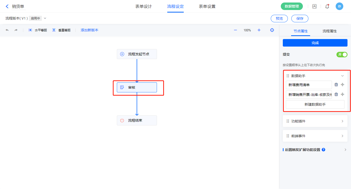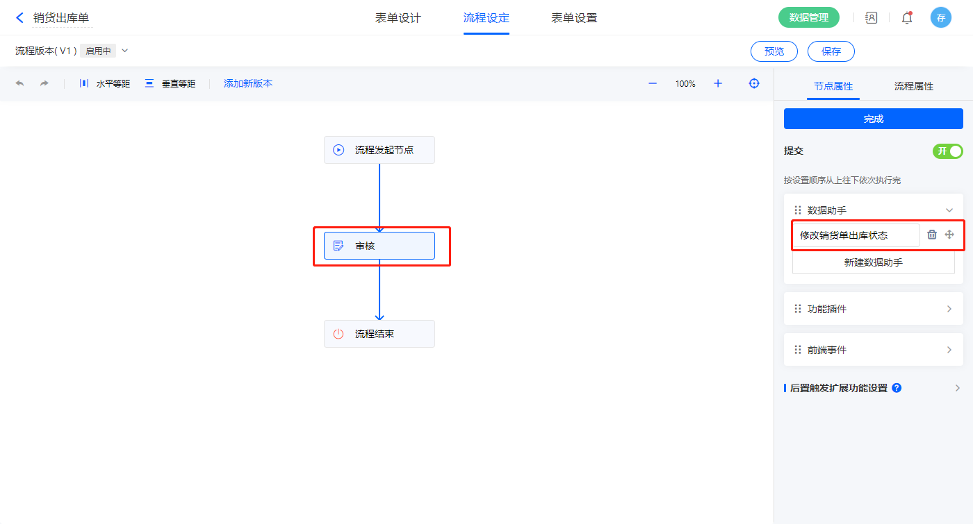 3)该表单是流程表单,设置流程节点审核,该节点属性的节点权限提交设置一条数据助手,名称为修改销货单出库状态;