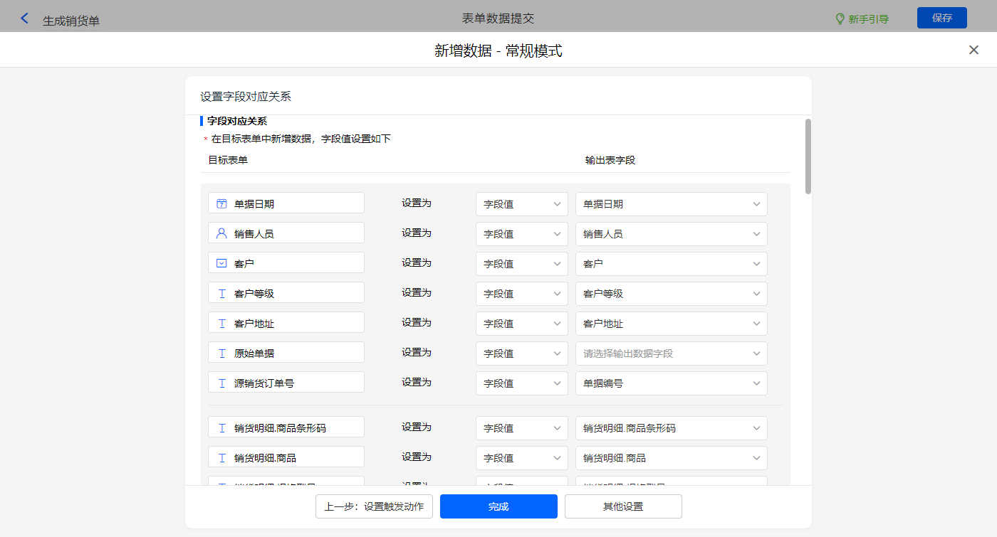 新增销货开票的数据助手,新增新增数据的执行动作,选择目标表单【销售开票】,选择对应字段,设置好点击【完成】并保存该数据助手;