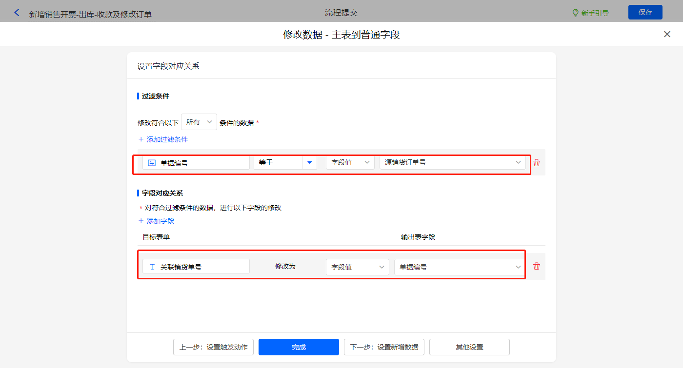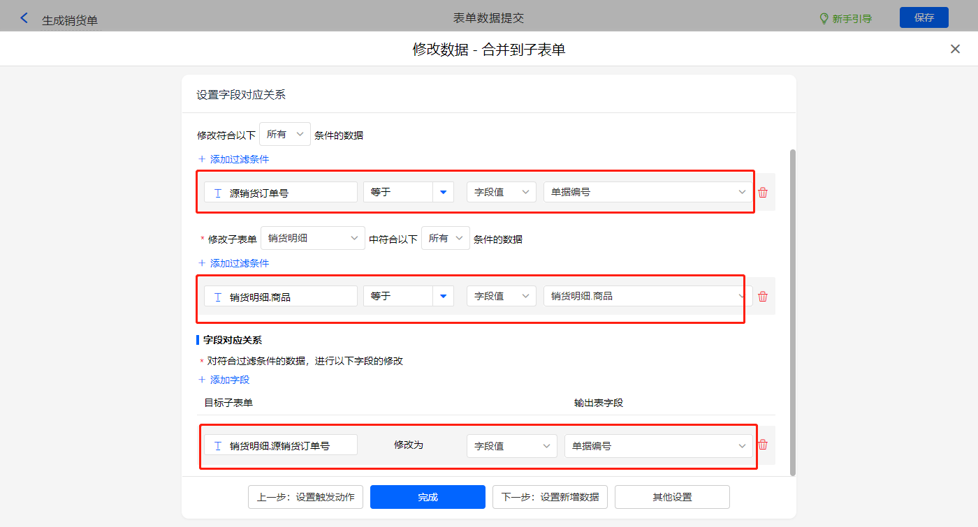 新增修改数据的执行动作,选择修改【销货单】表单,选择对应过滤条件,以及需要修改的字段,设置好点击【完成】并保存该数据助手;